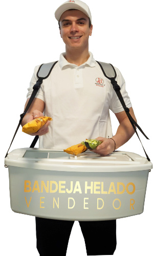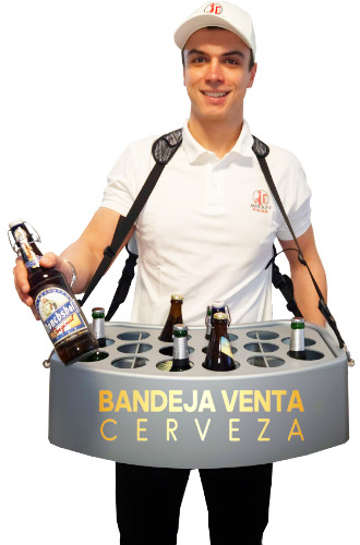 🚀 Bandeja innovadora para venta de café de Rocketpacks, perfecta para eventos y festivales 🍻. Vendedor sonriente ofrece café frías a los asistentes, usando una bandeja ergonómica portátil diseñada para máxima eficiencia y comodidad. Ideal para grandes concentraciones, venta ambulante y servicio rápido en conciertos y partidos 🎉.